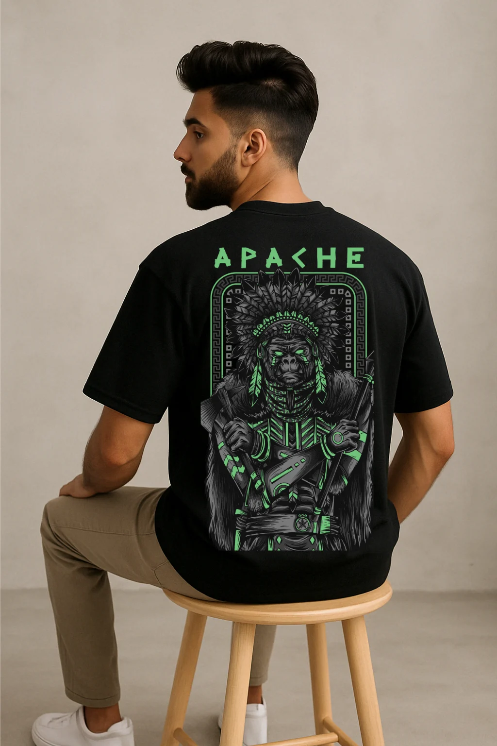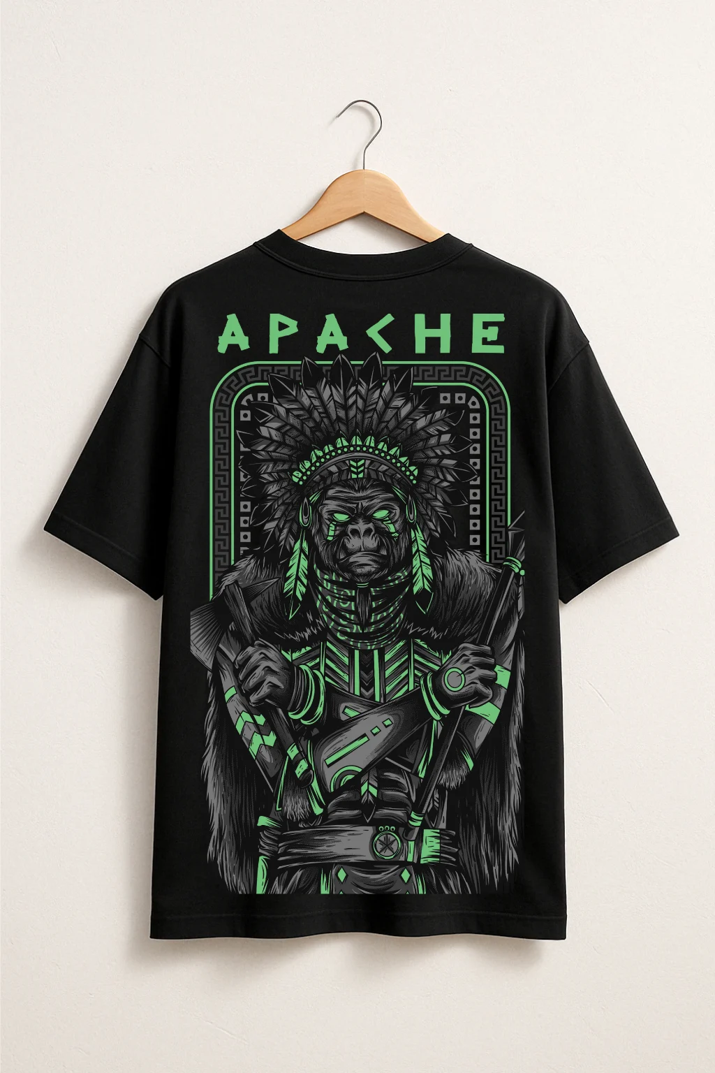 Channel fearless vibes with this black Apache warrior oversized t-shirt. Neon green tribal print, streetwear perfect, soft cotton feel. Shop Stylata today!
